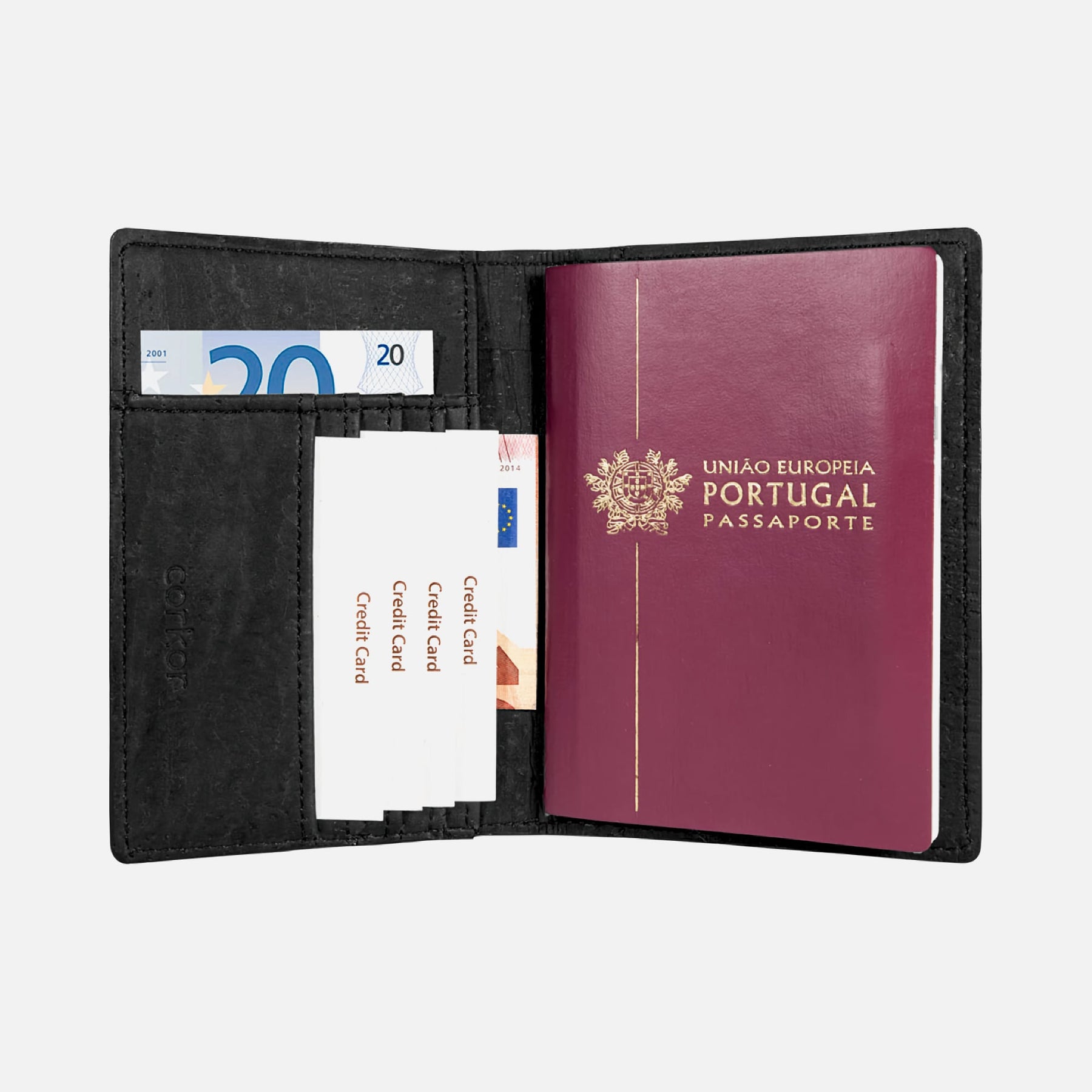 Corkor Vegan Cork Passport Wallet in black, interior view showing passport slot, card holders, and cash compartment