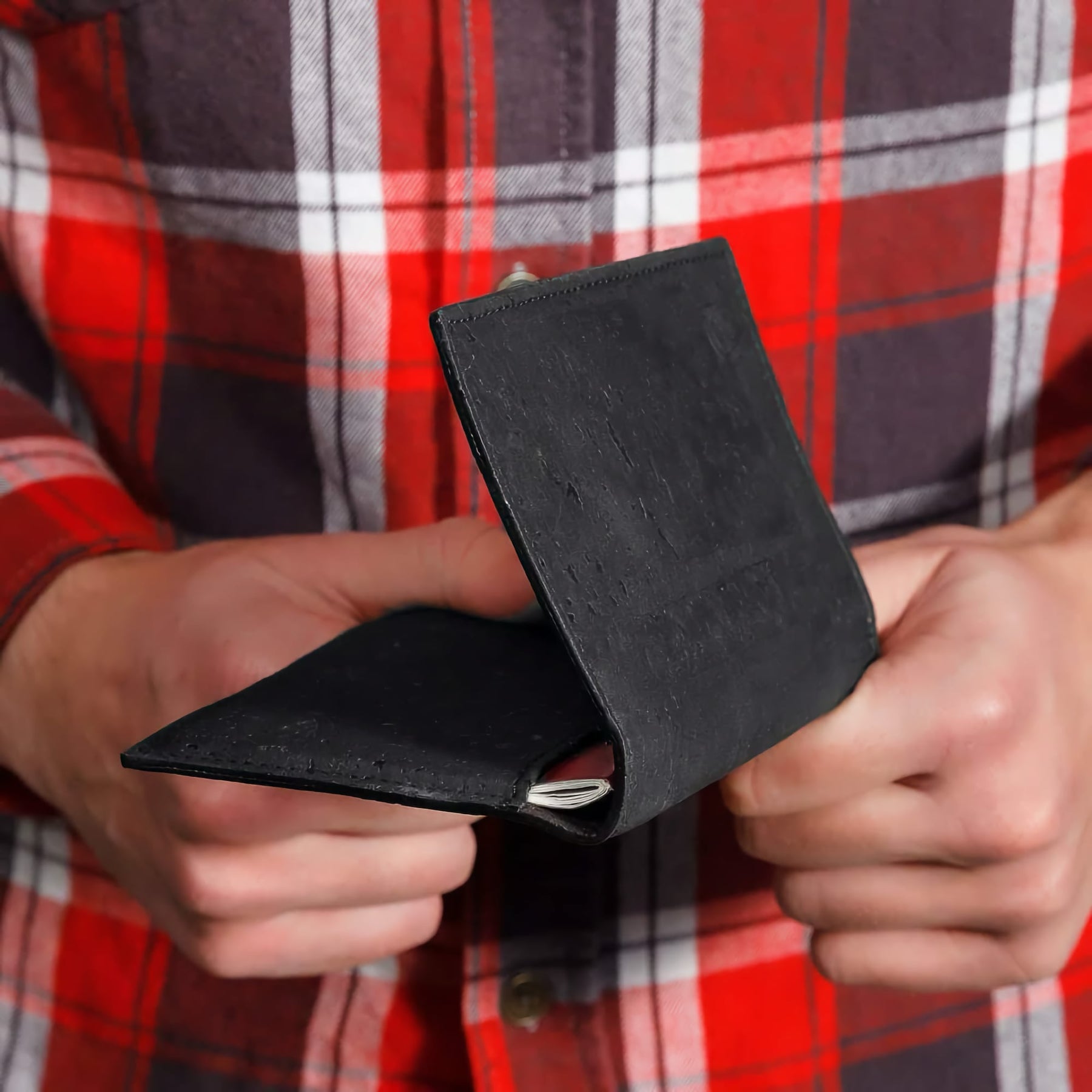 Corkor Vegan Cork Passport Wallet in black, shown being held by person wearing red plaid shirt